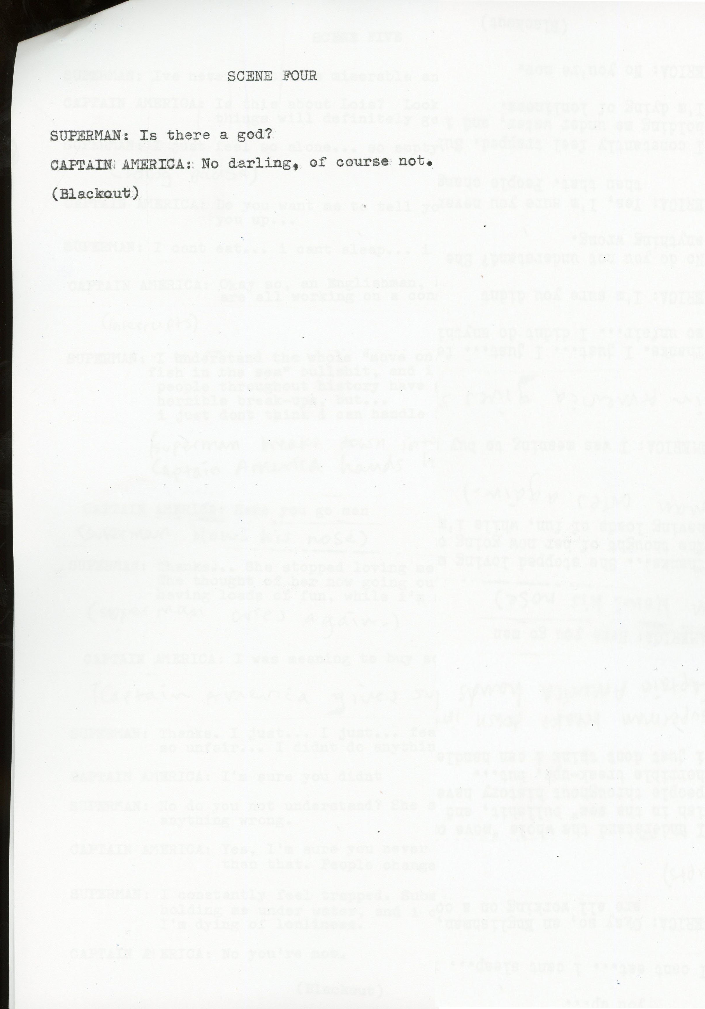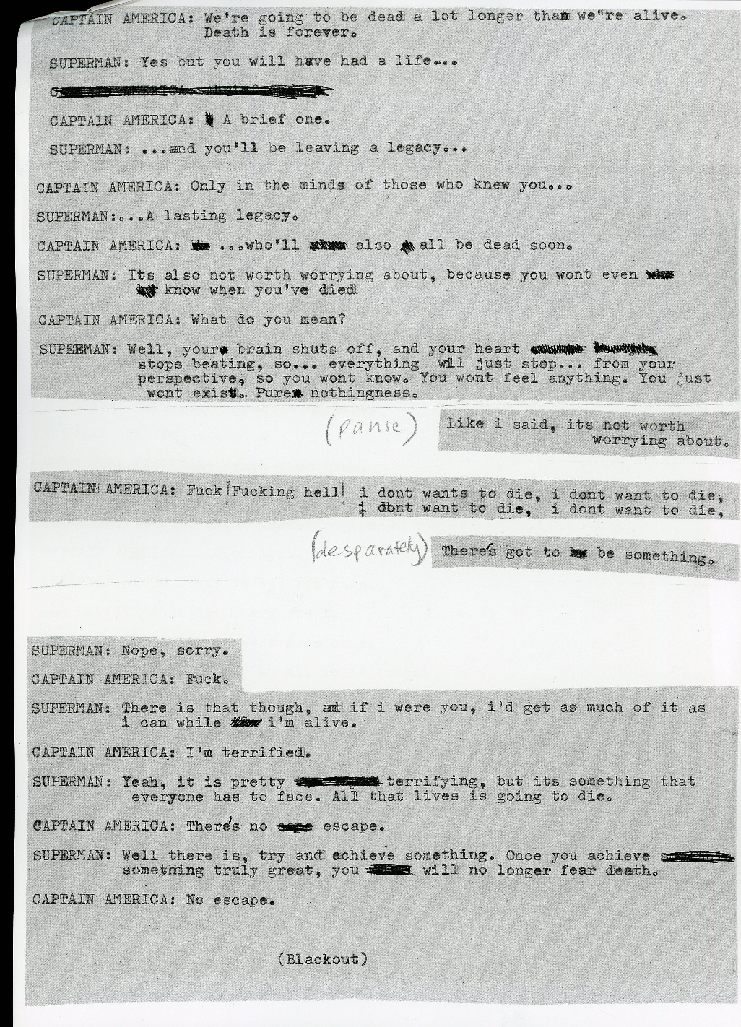 Their stoicism is compromised, as their genuine emotions are laid bare. Their usually sophisticated appearances are distorted by shiny costumes (painted with household gloss paint and spray paint, still wet at the time of filming – see Captain America's hands), which appear to be melting, evoking a submissive helplessness.